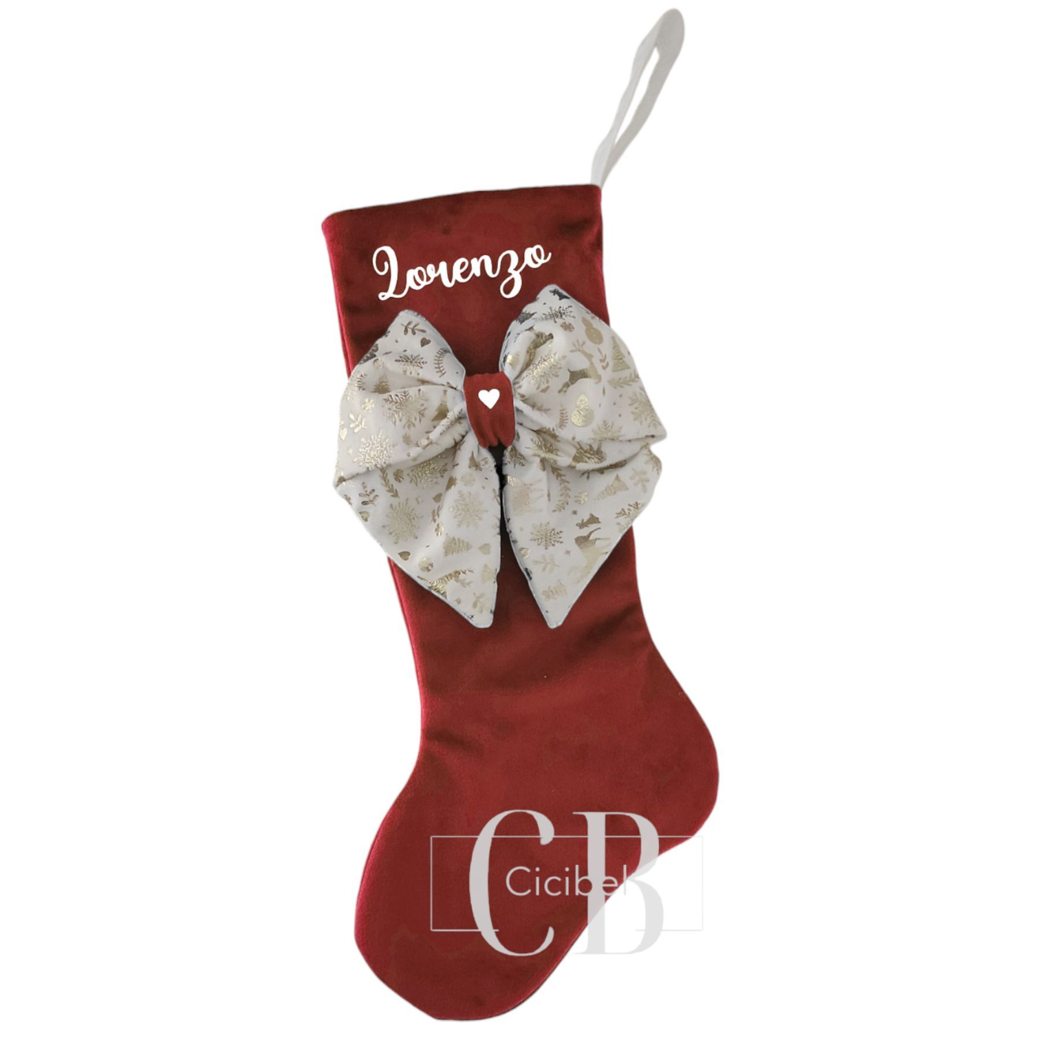 Calza della befana realizzata artigianalmente nel nostro laboratorio, personalizzabile con nome.
