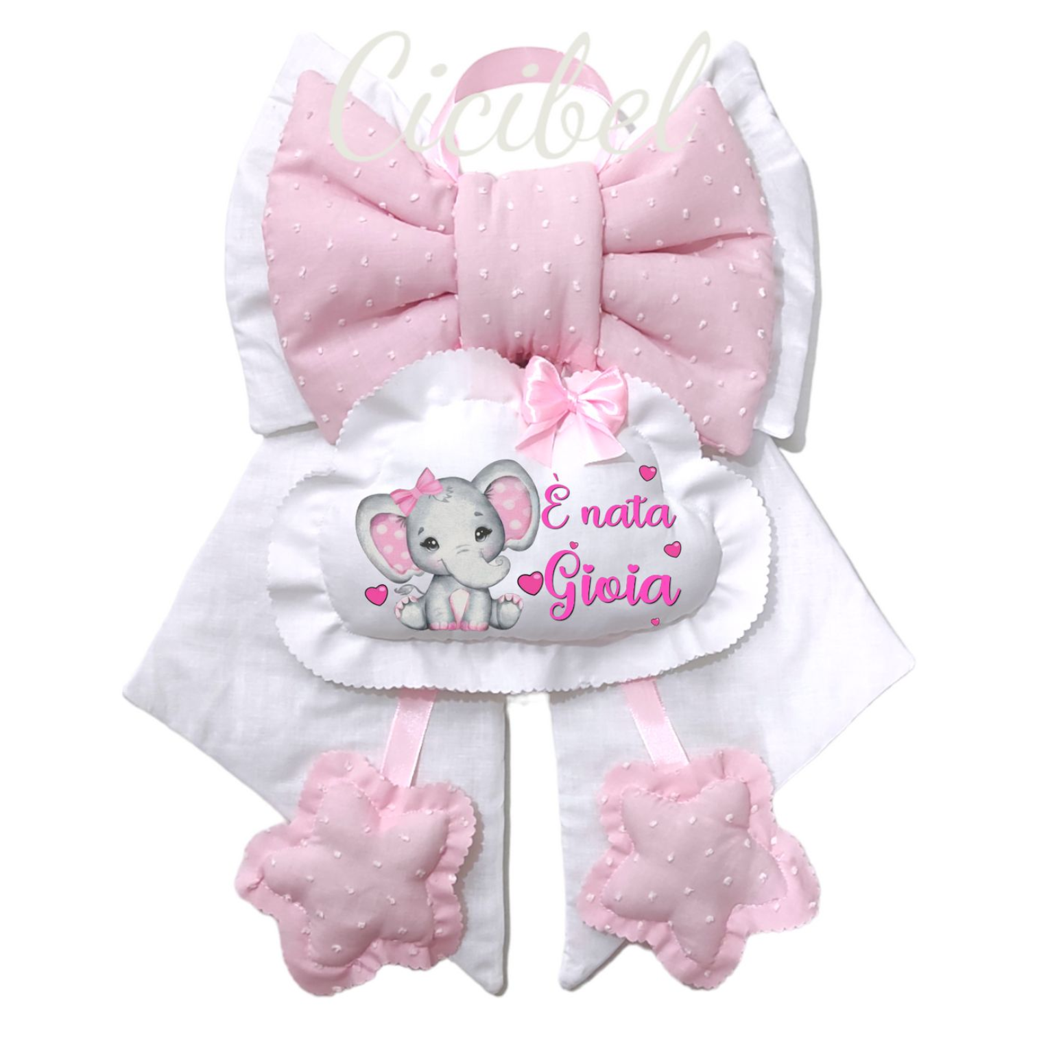 Fiocco in puro cotone rosa e bianco con 3 pendenti: una nuvoletta e due stelline.