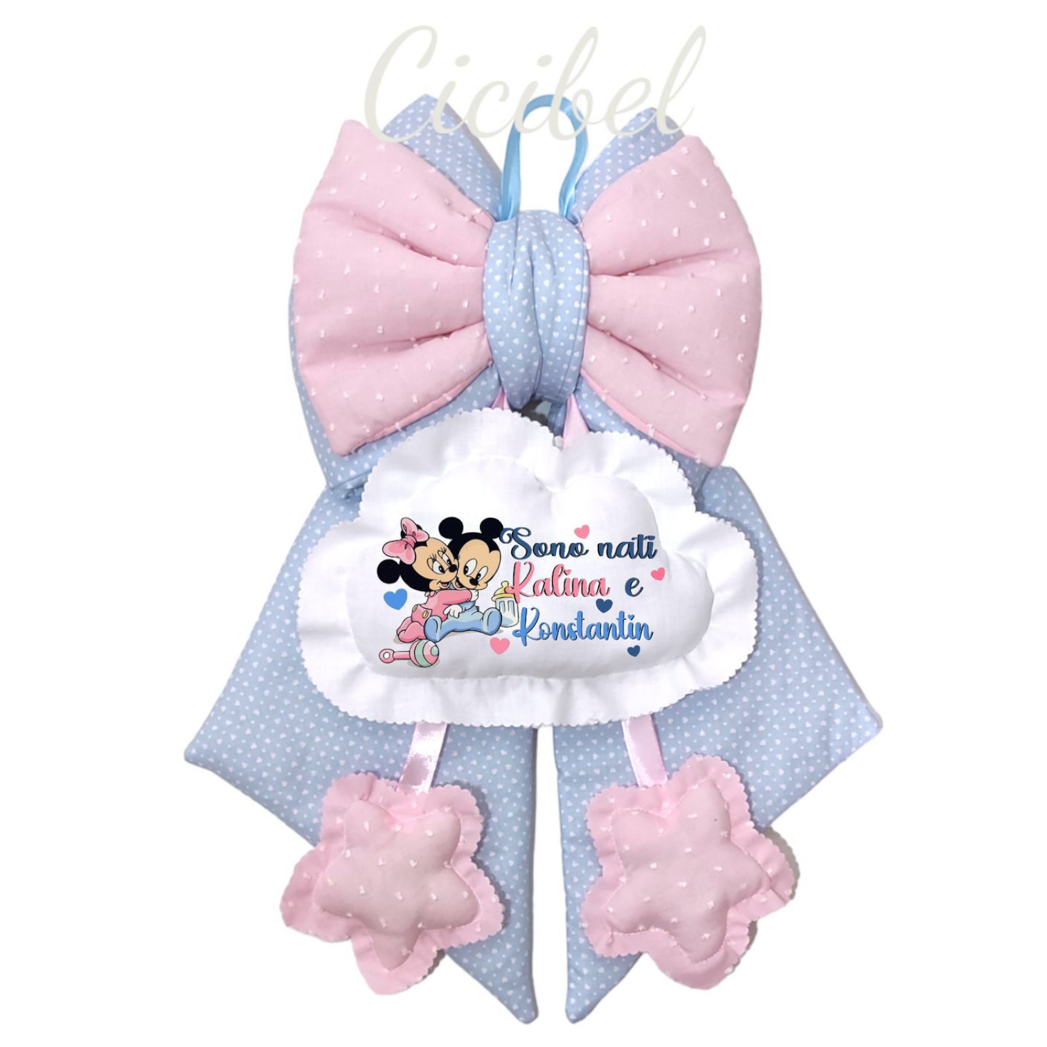 Fiocco gemellare in puro cotone celeste e rosa con 3 pendenti: una nuvoletta e due stelline, personalizzabile con dedica + nomi.