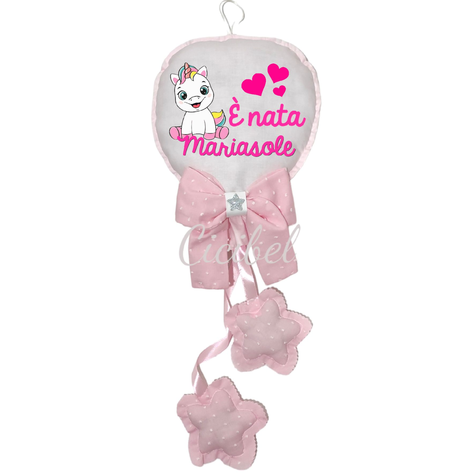 Annuncia in modo unico la nascita del tuo bebè con il fiocco nascita PALLONCINO. Personalizzabile con il nome del tuo bambino, realizzato artigianalmente nel nostro laboratorio italiano con 100% cotone.