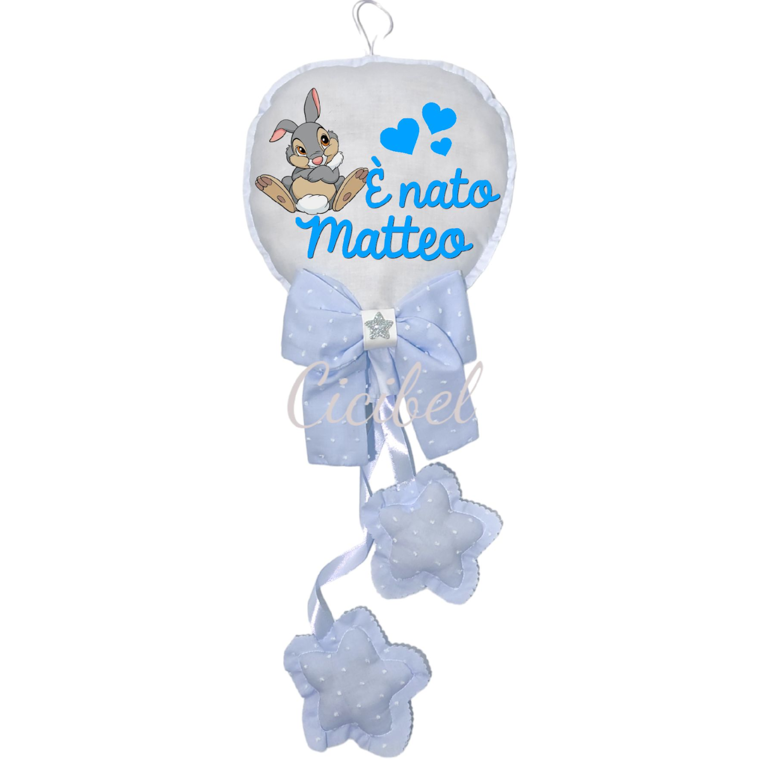 Annuncia in modo unico la nascita del tuo bebè con il fiocco nascita PALLONCINO. Personalizzabile con il nome del tuo bambino, realizzato artigianalmente nel nostro laboratorio italiano con 100% cotone.
