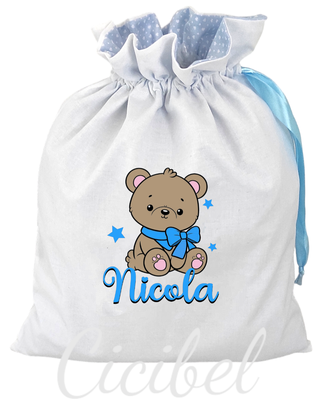 Sacchetto porta cambio foderato internamente, personalizzabile con nome. Realizzato artigianalmente nel nostro laboratorio(MADE IN ITALY).